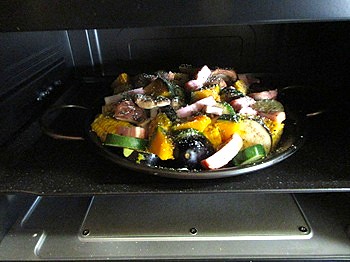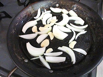 パエリヤの鍋にオリーブオイルを塗って、玉ねぎとニンニクを散らす。