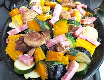 今回の具は ナス・ズッキーニ・茹でたコーン・レンジでチンしたカボチャ・椎茸・厚切りベーコン。 伊豆産の椎茸美味しかった〜 肉厚で香りが良かった。