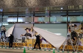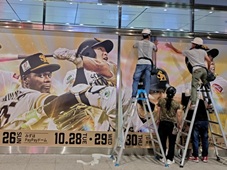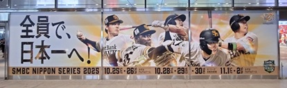 第6戦終わった日の夜、ほろ酔いのニヤニヤで通りかかった博多駅。ガラス面に貼られていたCSの巨大広告を剥がしているところに遭遇。
