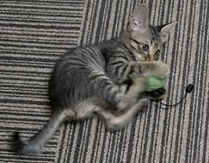 で、棒の先にネズミのおもちゃがついたやつをオトボケ様に渡すと、子猫はすぐさまとびついてじゃれるし、オトボケ様はキャハキャハ言って一緒に遊んでくれてまあお互い楽しそう楽しそう。
