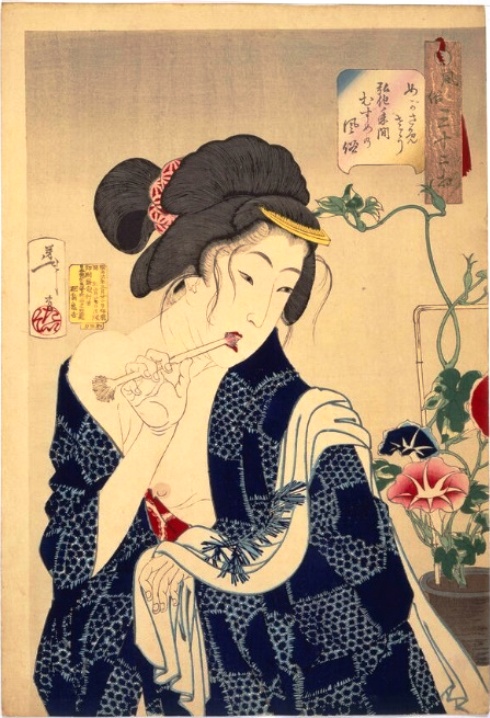 で、寝起きの余韻を残した若い女性が、髪を乱したまま “ 房楊枝 ” を用いて歯を磨いています♪