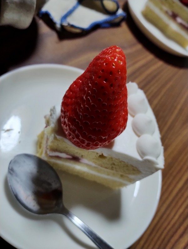 本人が買ってきたケーキでお祝い。どでかいイチゴちゃんを乗っけて豪華!